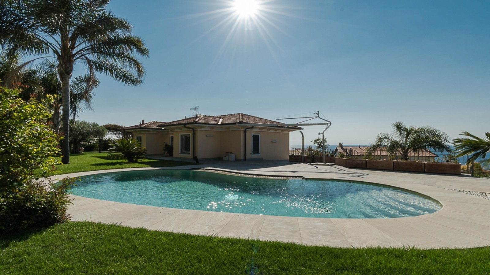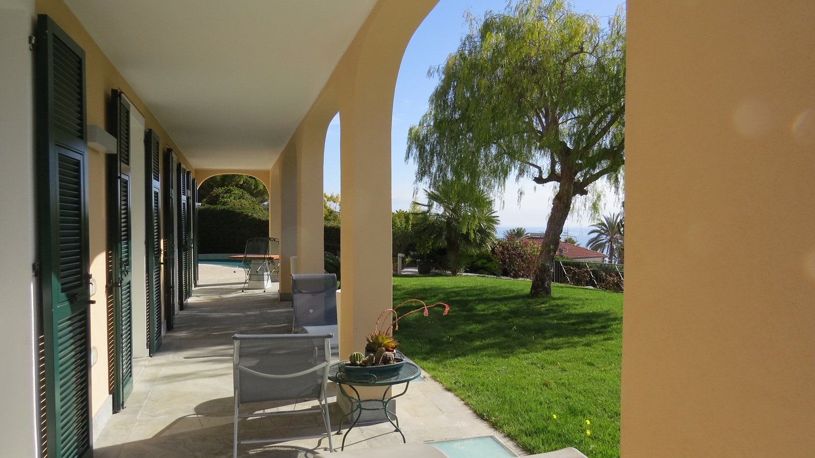 Alle spalle del centro storico, in un contesto di assoluta tranquillità con vista mare, a pochi passi dai servizi e dai ristoranti, proponiamo in vendita una villa di 361 m2 con portico di 197 m2 e terrazza panoramica di 71 m2 al primo piano. Il giardino, disposto su due fasce è di 1600 m2 ospita due piscine da 42 mq. cadauna con due locali tecnici indipendenti, a completare la proprietà due garage singoli di 21 m2 circa cadauno ed un più ampio garage di 40 m2 con ampio spazio di manovra. Location esclusiva con piacevole passeggio tra la pineta e il porto per arrivare alla passeggiata mare e alle spiagge. La villa oggi è bifamiliare con due ingressi indipendenti ed è facilmente trasformabile in una unica grande villa. Si sviluppa su tre piani : piano primo adibito a zona notte con quattro camere da letto e due bagni; piano terra con zona giorno, grande salone doppio, office, due cucine attrezzate, due bagni; piano interrato con due dressing, due lavanderie, due grandi locali per accessori, disimpegno, sauna e due bagni. In piena proprietà anche i 212 m2 di strada privata che portano all'accesso della villa. Il prezzo richiesto si riferisce alla vendita della proprietà intera. Le porzioni separate vengono proposte in vendita rispettivamente ad euro 2.500.000 la porzione ovest di 193 m2 ed euro 2.200.000 la porzione est di 168 m2.